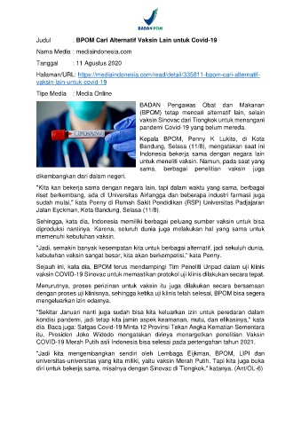 Judul : BPOM Cari Alternatif Vaksin Lain untuk Covid-19