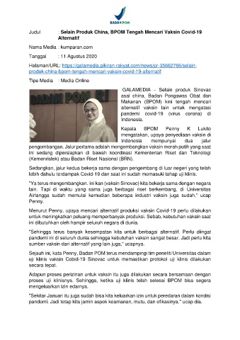 Judul : Selain Produk China, BPOM Tengah Mencari Vaksin Covid-19