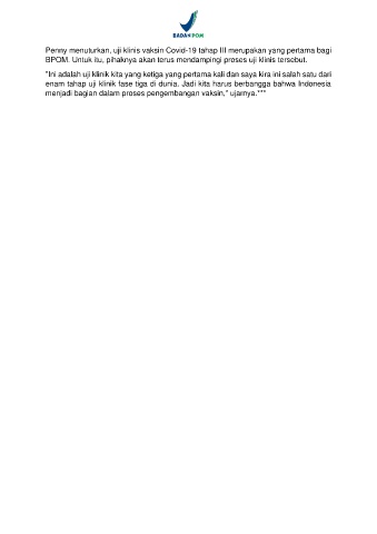 Penny menuturkan, uji klinis vaksin Covid-19 tahap III merupakan yang pertama bagi