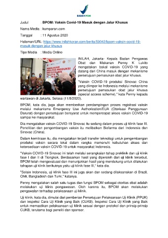 Judul : BPOM: Vaksin Covid-19 Masuk dengan Jalur Khusus