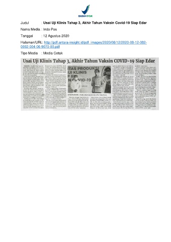 Judul : Usai Uji Klinis Tahap 3, Akhir Tahun Vaksin Covid-19 Siap Edar Nama Media : Indo Pos Tanggal : 12 Agustus 2020 Halaman/URL: http://pdf.antara-insight.id/pdf_images/2020/08/12/2020-08-12-082- 0002-004-06-9070-00.pdf Tipe Media : Media Cetak