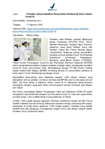 Judul : Presiden Jokowi Saksikan Penyuntikan Perdana Uji Klinis Vaksin