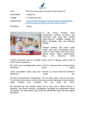 Judul : Bio Farma Kantongi Izin Produksi Vaksin Covid-19