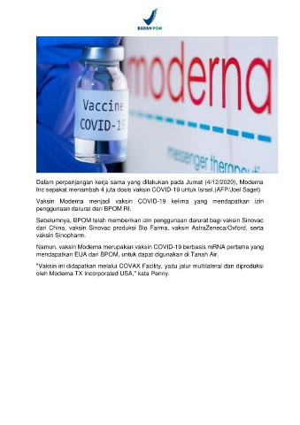 Dalam perpanjangan kerja sama yang dilakukan pada Jumat (4/12/2020), Moderna