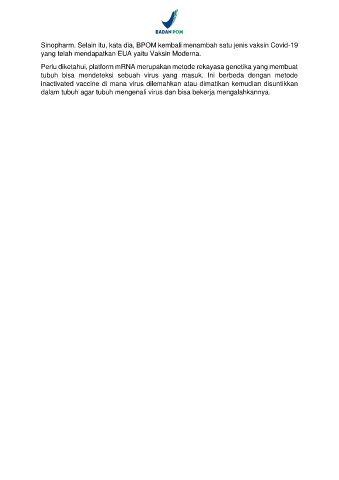 Sinopharm. Selain itu, kata dia, BPOM kembali menambah satu jenis vaksin Covid-19