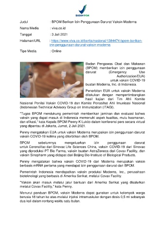 Judul : BPOM Berikan Izin Penggunaan Darurat Vaksin Moderna