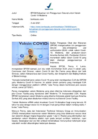 Judul : BPOM Keluarkan Izin Penggunaan Darurat untuk Vaksin