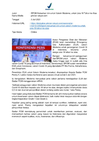 Judul : BPOM Keluarkan Izin untuk Vaksin Moderna, untuk Usia 18 Tahun ke Atas