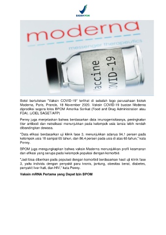BPOM juga mengungkapkan bahwa vaksin Moderna menunjukkan profil keamanan