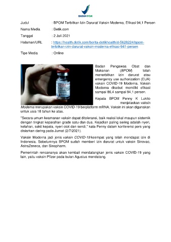 Judul : BPOM Terbitkan Izin Darurat Vaksin Moderna, Efikasi 94,1 Persen