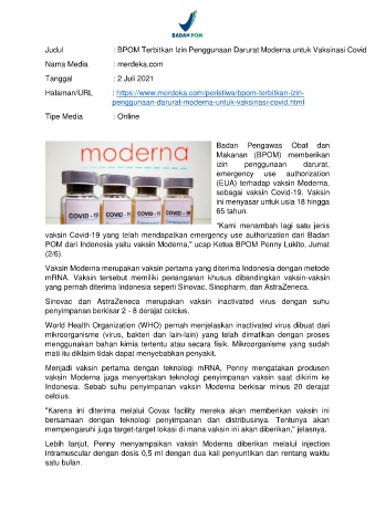 Judul : BPOM Terbitkan Izin Penggunaan Darurat Moderna untuk Vaksinasi Covid