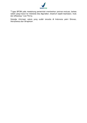 "Tugas BPOM yaitu mendukung pemerintah memberikan jaminan evaluasi, bahwa