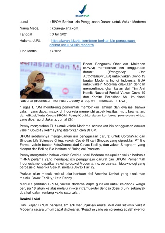 Judul : BPOM Berikan Izin Penggunaan Darurat untuk Vaksin Moderna