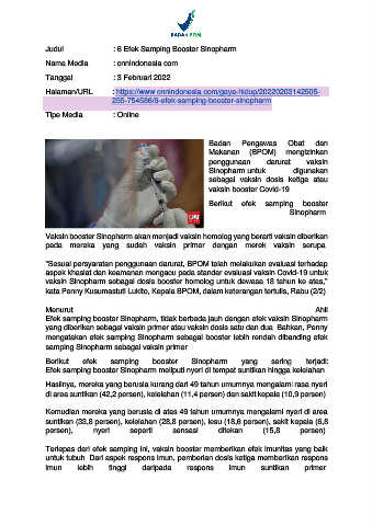 Page 110 - 020222_Badan POM Terbitkan Persetujuan Penggunaan Darurat Vaksin Sinopharm sebagai Dosis Booster