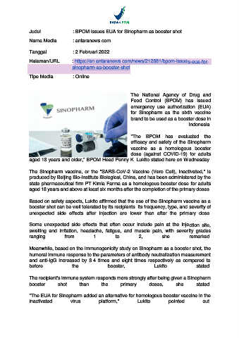 Page 32 - 020222_Badan POM Terbitkan Persetujuan Penggunaan Darurat Vaksin Sinopharm sebagai Dosis Booster