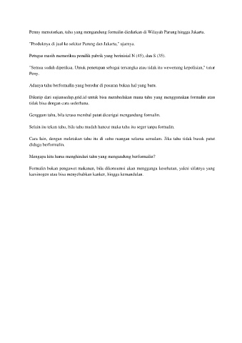 Penny menuturkan, tahu yang mengandung formalin diedarkan di Wilayah Parung hingga Jakarta.