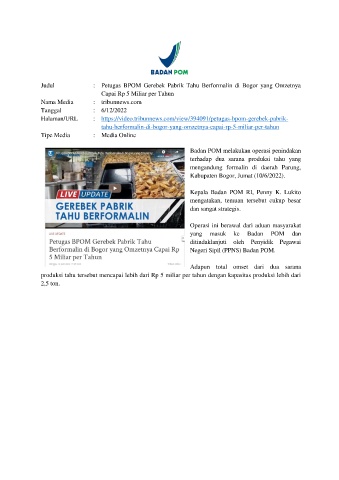 Judul : Petugas BPOM Gerebek Pabrik Tahu Berformalin di Bogor yang Omzetnya