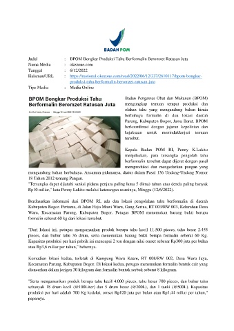 Judul : BPOM Bongkar Produksi Tahu Berformalin Beromzet Ratusan Juta