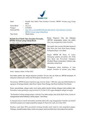 Judul : Waduh! Dua Pabrik Tahu Gunakan Formalin, BPOM: Temuan yang Cukup
