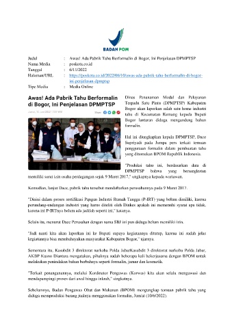 Judul : Awas! Ada Pabrik Tahu Berformalin di Bogor, Ini Penjelasan DPMPTSP