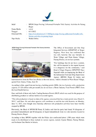 Judul : BPOM Stops Forcing Unlicensed Formalin Tofu Factory Activities In Parung