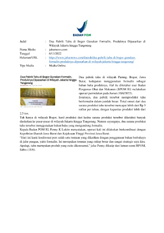 Judul : Dua Pabrik Tahu di Bogor Gunakan Formalin, Produknya Dipasarkan di