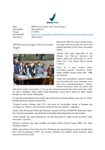 Halaman/URL : https://www.metropolitan.id/2022/06/bpom-usut-jaringan-tahu-formalin-bogor/