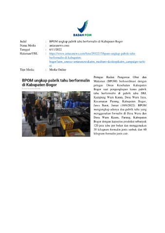 Judul : BPOM ungkap pabrik tahu berformalin di Kabupaten Bogor