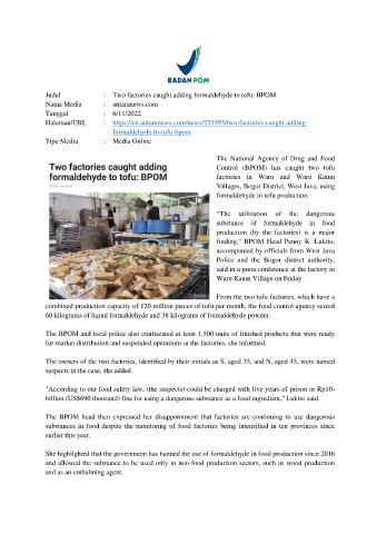 Judul : Two factories caught adding formaldehyde to tofu: BPOM