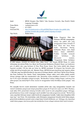 Halaman/URL : https://wartaekonomi.co.id/read420642/bpom-bongkar-dua-pabrik-tahu-