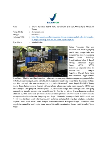 Judul : BPOM Temukan Pabrik Tahu Berformalin di Bogor, Omzet Rp 5 Miliar per