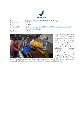 Judul : Pengungkapan Dua Pabrik Tahu Berformalin di Bogor