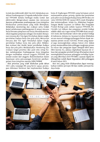 luruh personel organisasi. Hadirnya nilai-nilai Agen Perubahan, dan Tim Media Sosial; Peny- 2022 yaitu Campaign RB yang berisi upaya penera- katkan indeksi persepsi RB dan indeks persepsi bu-