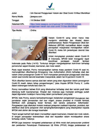 Judul : Izin Darurat Penggunaan Vaksin dan Obat Covid-19 Bisa Diterbitkan