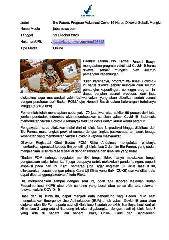 Judul : Bio Farma: Program Vaksinasi Covid-19 Harus Dikawal Sebaik Mungkin