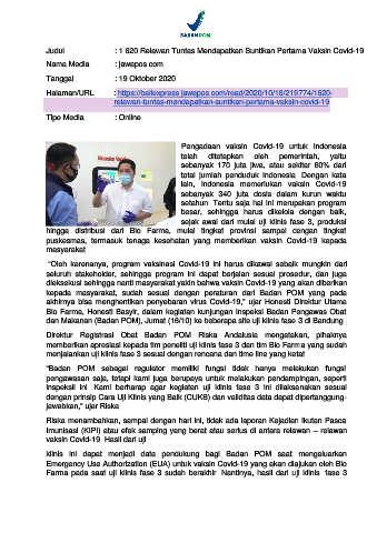 Judul : 1.620 Relawan Tuntas Mendapatkan Suntikan Pertama Vaksin Covid-19