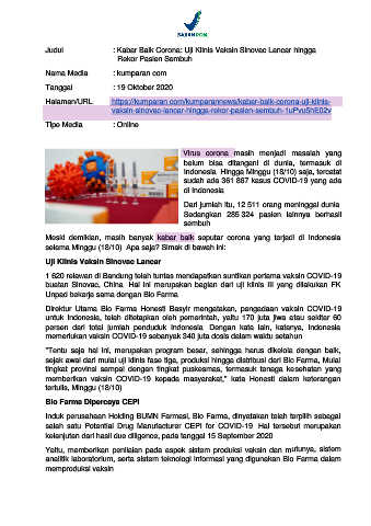 Judul : Kabar Baik Corona: Uji Klinis Vaksin Sinovac Lancar hingga
