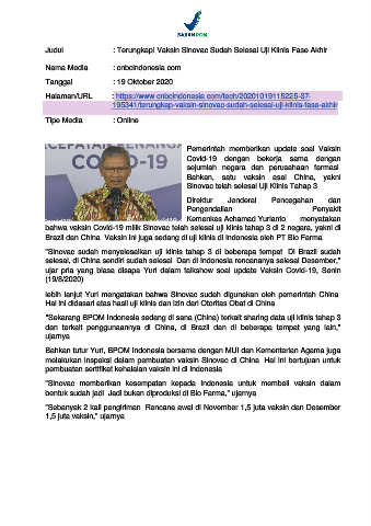 bahwa vaksin Covid-19 milik Sinovac telah selesai uji klinis tahap 3 di 2 negara, yakni di