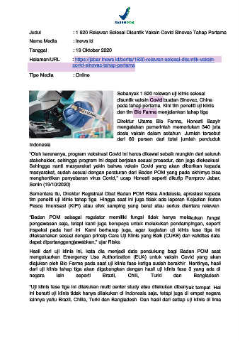 Judul : 1.620 Relawan Selesai Disuntik Vaksin Covid Sinovac Tahap Pertama