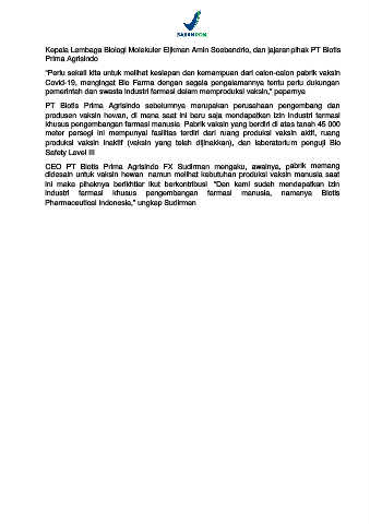 produksi vaksin inaktif (vaksin yang telah dijinakkan), dan laboratorium penguji Bio