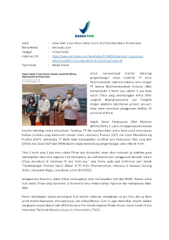Judul : Kabar Baik! 1 Juta Dosis Vaksin Covid-19 Zifivax Diproduksi di Indonesia