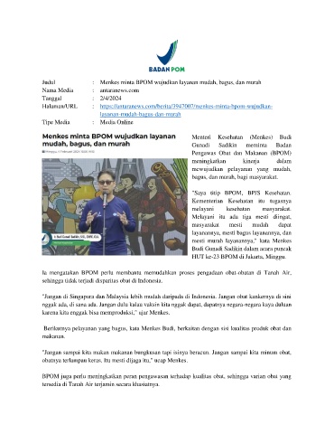 Judul : Menkes minta BPOM wujudkan layanan mudah, bagus, dan murah