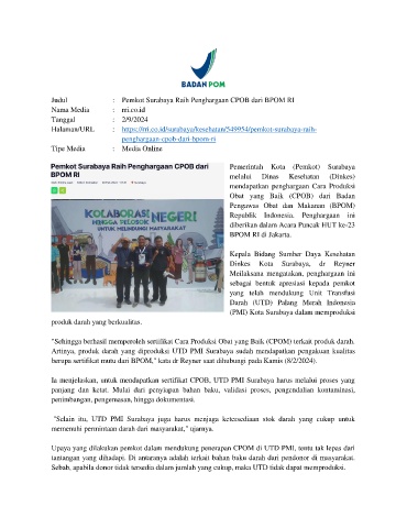 Judul : Pemkot Surabaya Raih Penghargaan CPOB dari BPOM RI