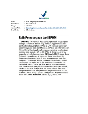 Judul : Raih Penghargaan dari BPOM Nama Media : Pikiran Rakyat Tanggal : 2/7/2024 Halaman/URL : https://app.kurasi.media/view?id=65c2c8139c2509615f8d71d8 Tipe Media : Media Cetak
