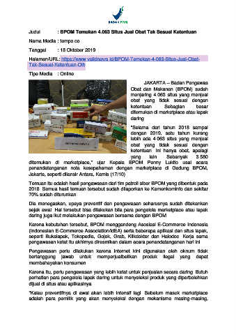 Judul : BPOM Temukan 4.063 Situs Jual Obat Tak Sesuai Ketentuan