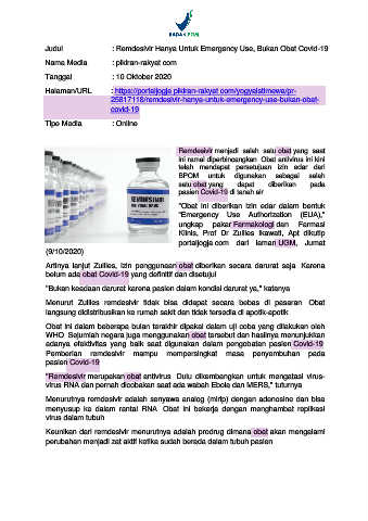 Judul : Remdesivir Hanya Untuk Emergency Use, Bukan Obat Covid-19