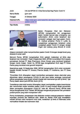 Page 46 - Penerbitan Siaran Pers Tingkatkan Angka Kesembuhan dan Turunkan Angka Kematian Pasien COVID-19, Badan POM Terbitkan Izin Penggunaan dalam Kondisi Darurat Obat Favipiravir dan Remdesivir_Neat