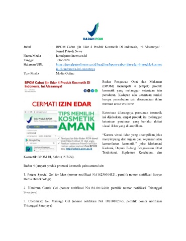 Halaman/URL : https://jurnalpatrolinews.co.id/headline/bpom-cabut-ijin-edar-4-produk-kosmet
