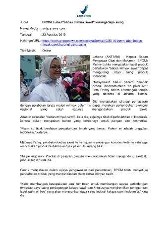 Judul : BPOM: Label "bebas minyak sawit" kurangi daya saing