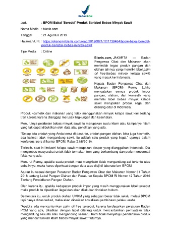 Judul : BPOM Bakal 'Beredel' Produk Berlabel Bebas Minyak Sawit